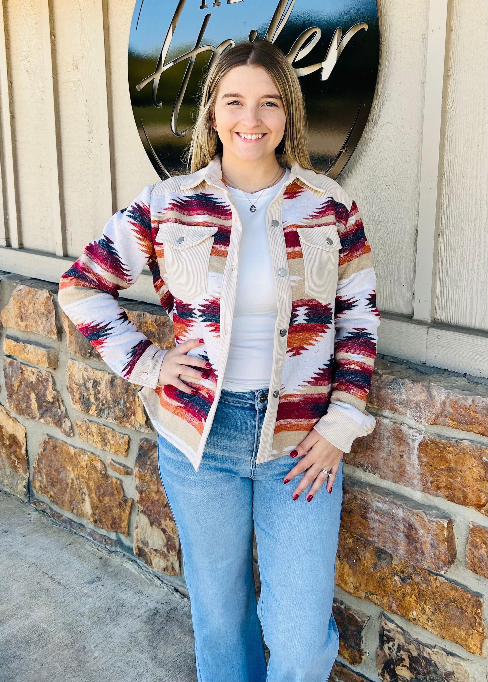 The Reba Shacket brings a playful twist to your wardrobe with its vibrant Aztec print. Perfect for layering on chilly days, this cozy shacket combines the charm of a shirt with the warmth of a jacket. Slip into bold patterns and feel the fun and comfort wherever you go!